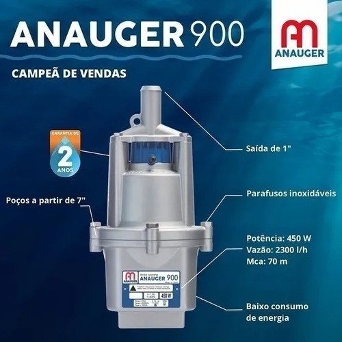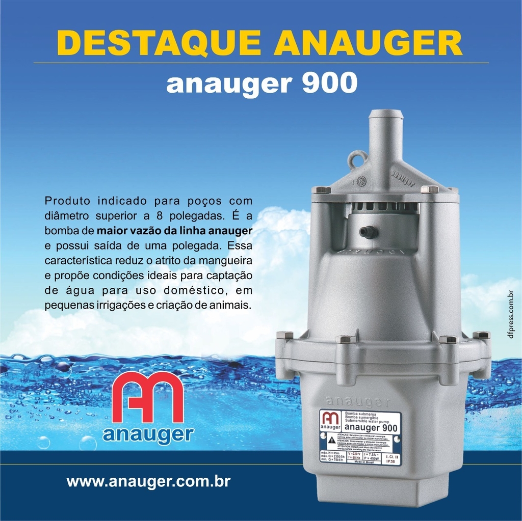 ANAUGER 900 5G: maior vazão da linha ANAUGER. Possui saída de 1 polegada, o que reduz o atrito na mangueira, condição ideal para as vazões que a bomba proporciona. Excelente rendimento com maior vazões e atende às necessidades de água para uma residência;