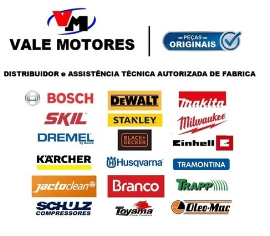A VALE MOTORES trabalha com Máquinas Elétricas, Ferramentas, Acessórios e Peças de Reposição ORIGINAIS das principais marcas do emrcado, como: Dewalt, Stanley, Black&Decker, Makita, Bosch, Skil, Dremel, Milwaukee, Einhell,Karcher, WAP, Jacto Clean, Guarany, Schulz, Tramontina, Husqvarna, Branco, Bufallo, Toyama e Oleo Mac.